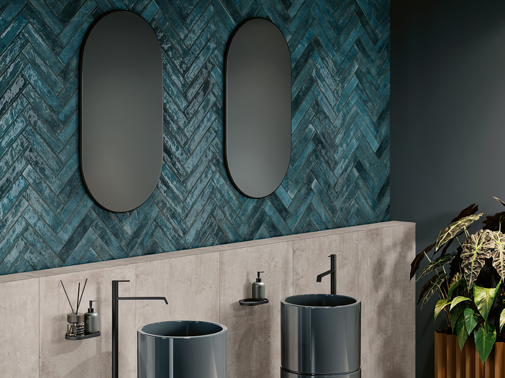 Glossy cobalt ceramic tiles add bold colour and striking character to interior and exterior walls.