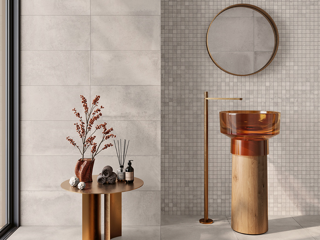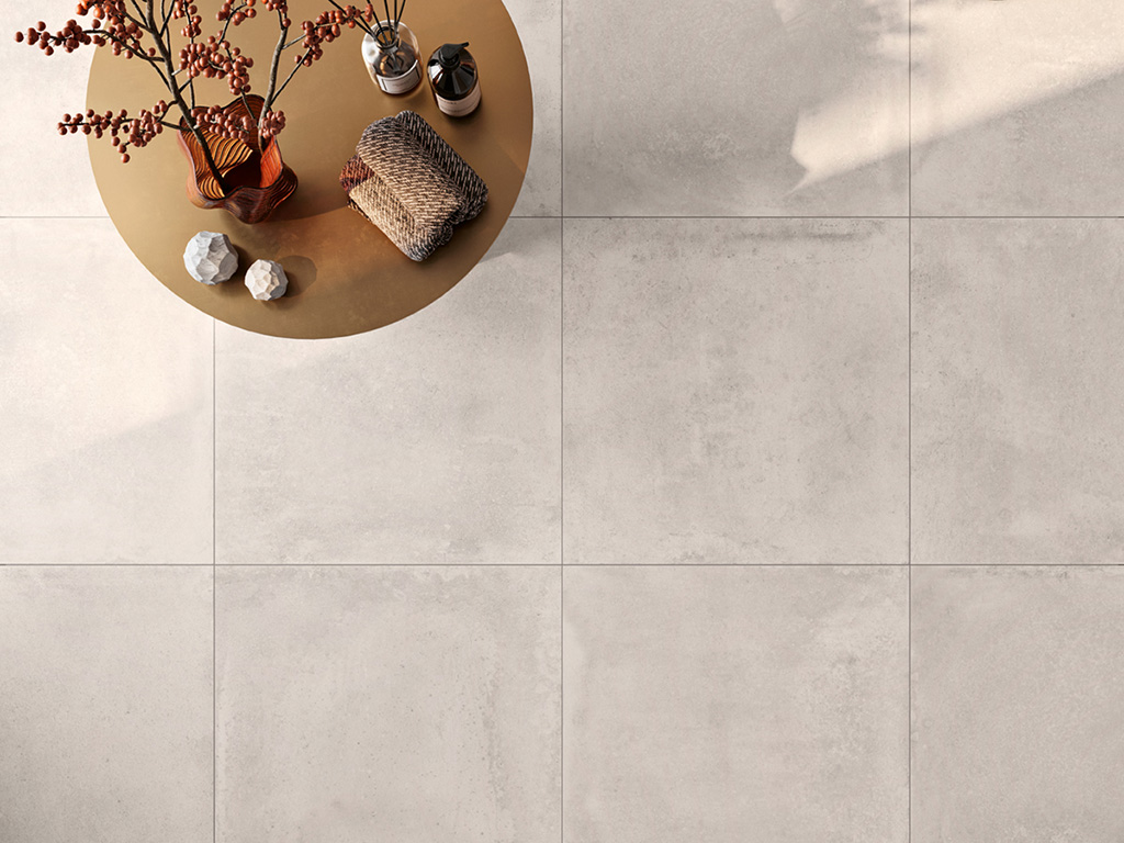 Soft grey porcelain tiles create a sleek and contemporary look.