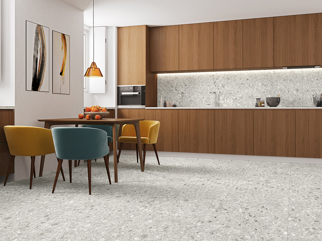 Soft grey‑neutral porcelain tiles featuring delicate speckling for a sleek, contemporary look.